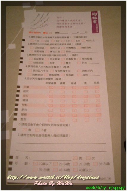 點完餐還附上兩張意見單給我們填寫(我幾乎都勾"普通"